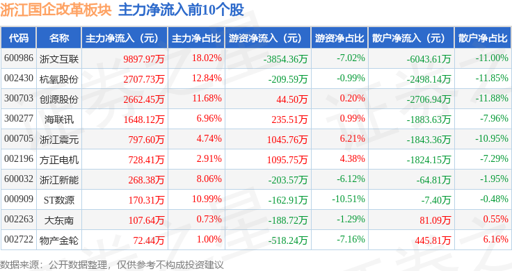 从资金流向上来看,当日浙江国企改革板块主力资金净流出3.95亿元,游资资金净流入1.62亿元,散户资金净流入2.34亿元。浙江国企改革板块个股资金流向见下表: