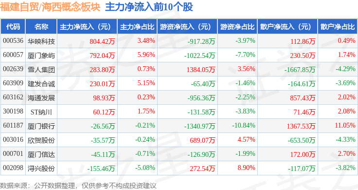 从资金流向上来看,当日福建自贸/海西概念板块主力资金净流出4.39亿元,游资资金净流入5077.61万元,散户资金净流入3.88亿元。福建自贸/海西概念板块个股资金流向见下表: