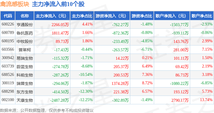 从资金流向上来看,当日禽流感板块主力资金净流出2794.37万元,游资资金净流出1229.25万元,散户资金净流入4023.62万元。禽流感板块个股资金流向见下表:
