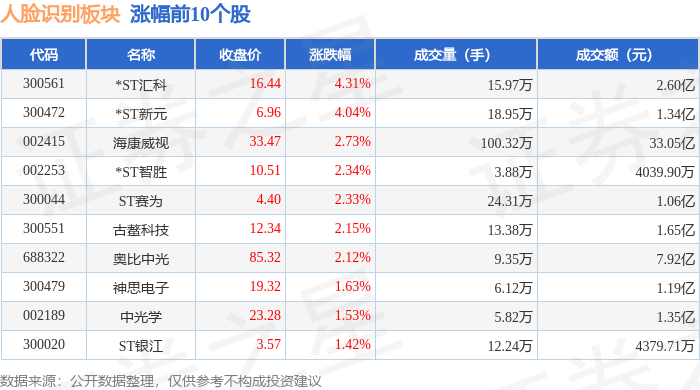 证券之星消息,10月22日人脸识别板块较上一交易日上涨0.85%,*ST汇科领涨。当日上证指数报收于3913.76,下跌0.07%。深证成指报收于12996.61,下跌0.62%。人脸识别板块个股涨跌见下表:
