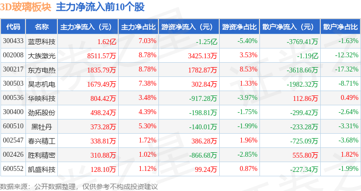 从资金流向上来看,当日3D玻璃板块主力资金净流出9.8亿元,游资资金净流入3.28亿元,散户资金净流入6.52亿元。3D玻璃板块个股资金流向见下表: