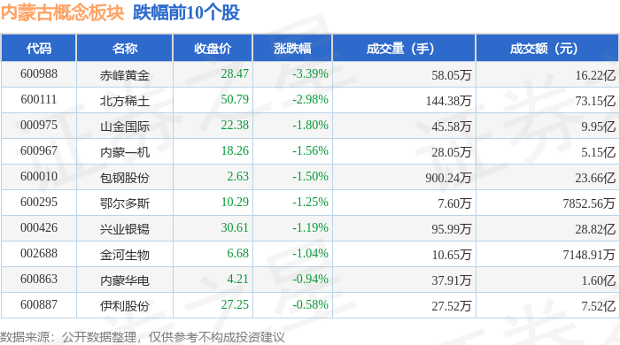 从资金流向上来看,当日内蒙古概念板块主力资金净流出13.59亿元,游资资金净流出1.43亿元,散户资金净流入15.03亿元。内蒙古概念板块个股资金流向见下表:
