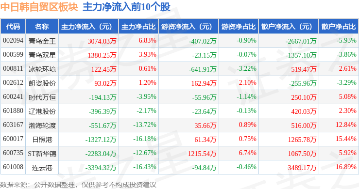 从资金流向上来看,当日中日韩自贸区板块主力资金净流出2.0亿元,游资资金净流入292.55万元,散户资金净流入1.97亿元。中日韩自贸区板块个股资金流向见下表: