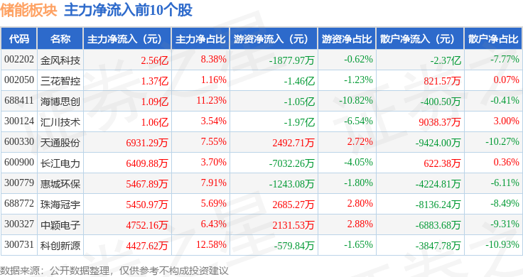 从资金流向上来看,当日储能板块主力资金净流出96.73亿元,游资资金净流入18.71亿元,散户资金净流入78.03亿元。储能板块个股资金流向见下表: