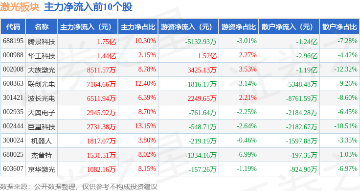 从资金流向上来看,当日激光板块主力资金净流入3.46亿元,游资资金净流入2.87亿元,散户资金净流出6.33亿元。激光板块个股资金流向见下表: