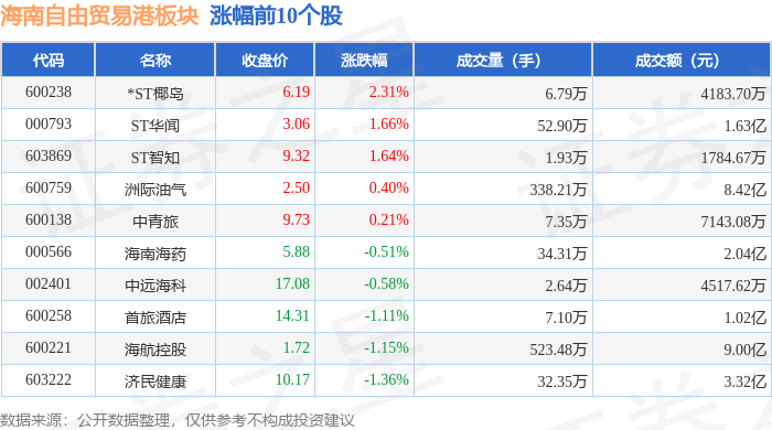 从资金流向上来看,当日海南自由贸易港板块主力资金净流出13.2亿元,游资资金净流入2.21亿元,散户资金净流入11.0亿元。海南自由贸易港板块个股资金流向见下表: