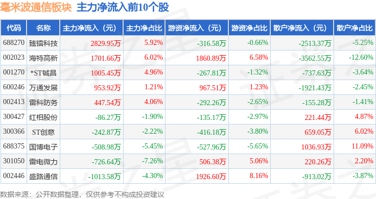 从资金流向上来看,当日毫米波通信板块主力资金净流出13.62亿元,游资资金净流入4.18亿元,散户资金净流入9.43亿元。毫米波通信板块个股资金流向见下表: