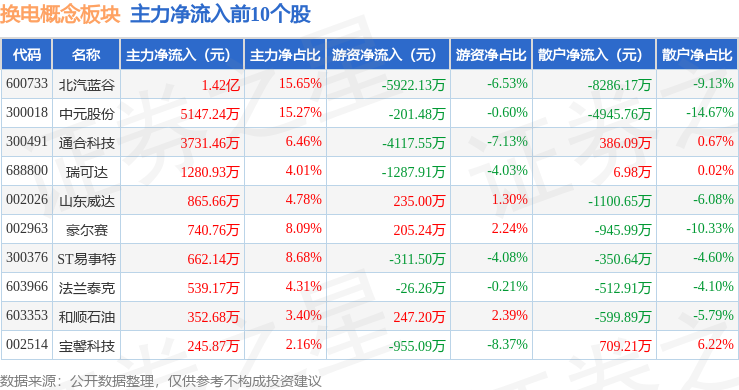 从资金流向上来看,当日换电概念板块主力资金净流出10.78亿元,游资资金净流入3.11亿元,散户资金净流入7.67亿元。换电概念板块个股资金流向见下表: