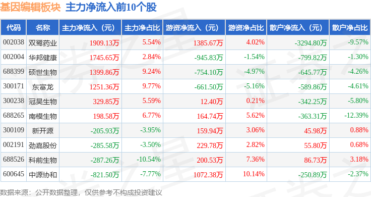 从资金流向上来看,当日基因编辑板块主力资金净流出3461.27万元,游资资金净流入4256.72万元,散户资金净流出795.45万元。基因编辑板块个股资金流向见下表: