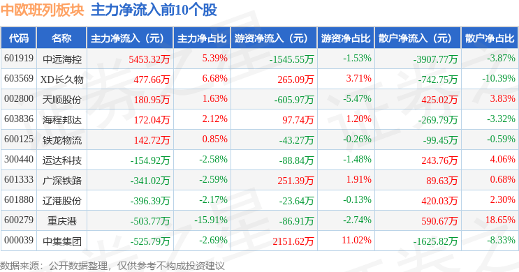 从资金流向上来看,当日中欧班列板块主力资金净流出3.52亿元,游资资金净流入1.66亿元,散户资金净流入1.86亿元。中欧班列板块个股资金流向见下表: