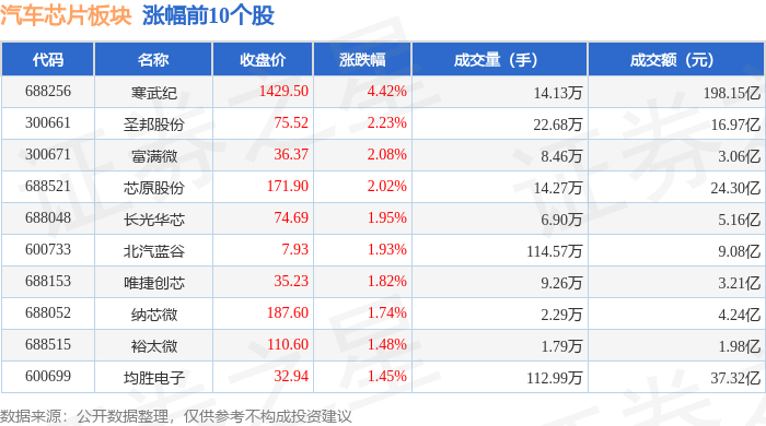 证券之星消息,10月22日汽车芯片板块较上一交易日上涨0.16%,寒武纪领涨。当日上证指数报收于3913.76,下跌0.07%。深证成指报收于12996.61,下跌0.62%。汽车芯片板块个股涨跌见下表: