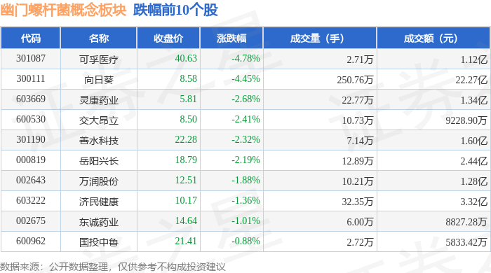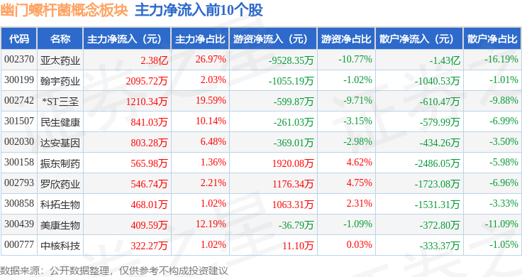 从资金流向上来看,当日幽门螺杆菌概念板块主力资金净流入6773.61万元,游资资金净流入2629.62万元,散户资金净流出9403.23万元。幽门螺杆菌概念板块个股资金流向见下表: