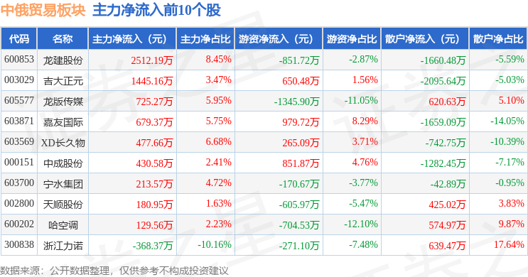 从资金流向上来看,当日中俄贸易板块主力资金净流出2.82亿元,游资资金净流入8793.15万元,散户资金净流入1.95亿元。中俄贸易板块个股资金流向见下表: