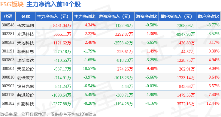 从资金流向上来看,当日F5G板块主力资金净流出9.63亿元,游资资金净流入8.41亿元,散户资金净流入1.22亿元。F5G板块个股资金流向见下表: