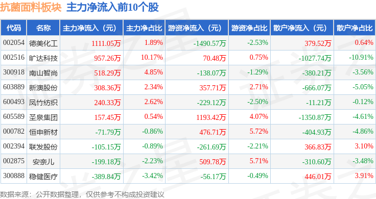 从资金流向上来看,当日抗菌面料板块主力资金净流出1.7亿元,游资资金净流出927.43万元,散户资金净流入1.79亿元。抗菌面料板块个股资金流向见下表: