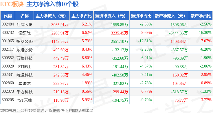 从资金流向上来看,当日ETC板块主力资金净流出10.42亿元,游资资金净流入1.48亿元,散户资金净流入8.94亿元。ETC板块个股资金流向见下表: