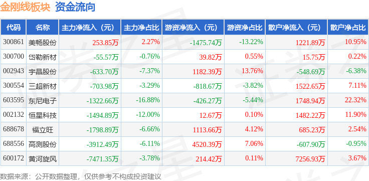 从资金流向上来看,当日金刚线板块主力资金净流出1.71亿元,游资资金净流入4362.66万元,散户资金净流入1.28亿元。金刚线板块个股资金流向见下表: