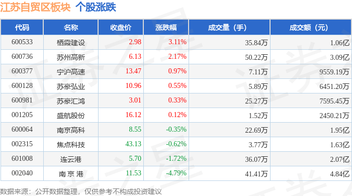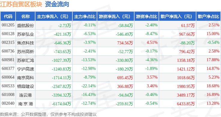 从资金流向上来看,当日江苏自贸区板块主力资金净流出1.77亿元,游资资金净流入273.04万元,散户资金净流入1.74亿元。江苏自贸区板块个股资金流向见下表: