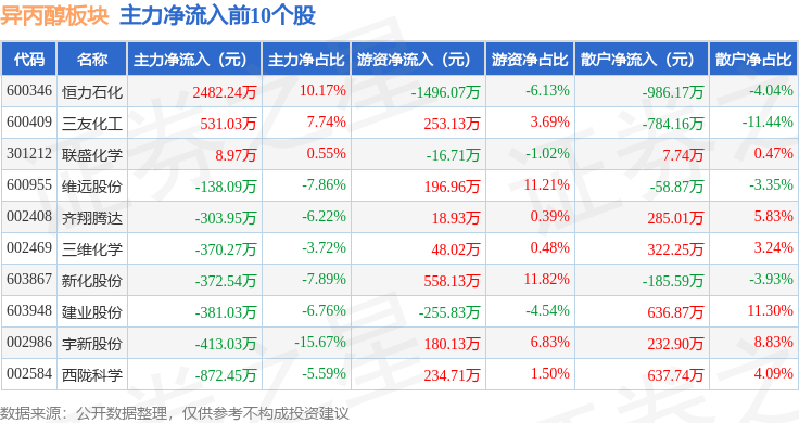 从资金流向上来看,当日异丙醇板块主力资金净流出5599.54万元,游资资金净流出4028.54万元,散户资金净流入9628.09万元。异丙醇板块个股资金流向见下表: