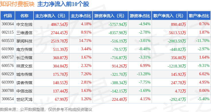 从资金流向上来看,当日知识付费板块主力资金净流出1.23亿元,游资资金净流出1.4亿元,散户资金净流入2.63亿元。知识付费板块个股资金流向见下表:
