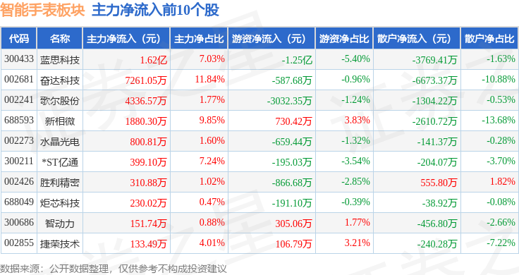 从资金流向上来看,当日智能手表板块主力资金净流出10.47亿元,游资资金净流入2.33亿元,散户资金净流入8.14亿元。智能手表板块个股资金流向见下表:
