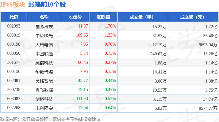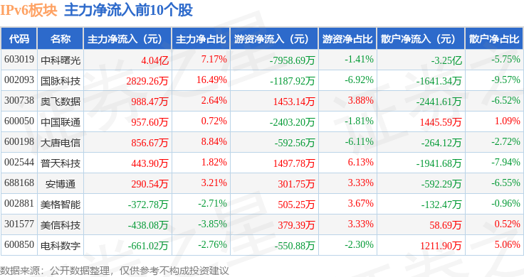 从资金流向上来看,当日IPv6板块主力资金净流出6.67亿元,游资资金净流入2.33亿元,散户资金净流入4.34亿元。IPv6板块个股资金流向见下表: