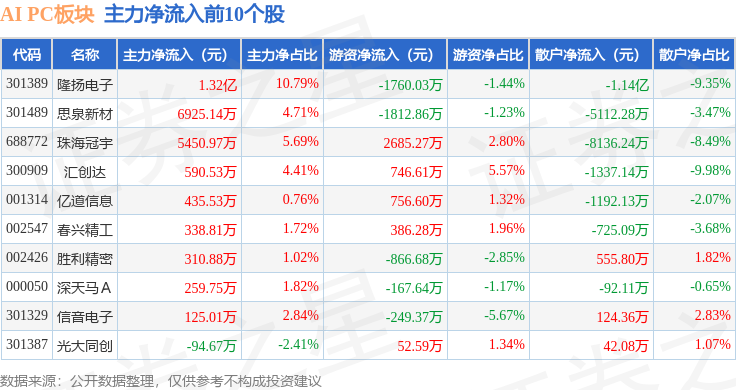 从资金流向上来看,当日AI PC板块主力资金净流出14.45亿元,游资资金净流入4.95亿元,散户资金净流入9.5亿元。AI PC板块个股资金流向见下表: