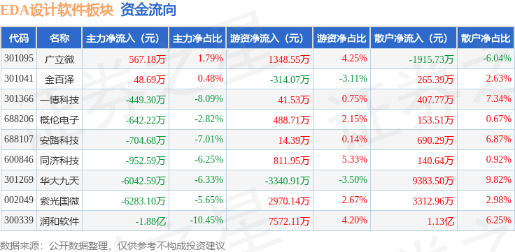 从资金流向上来看,当日EDA设计软件板块主力资金净流出3.33亿元,游资资金净流入9592.38万元,散户资金净流入2.37亿元。EDA设计软件板块个股资金流向见下表: