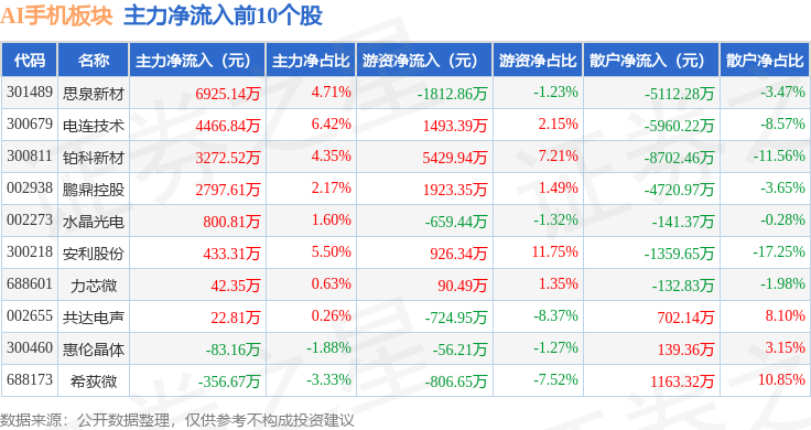 从资金流向上来看,当日AI手机板块主力资金净流出24.23亿元,游资资金净流入8.58亿元,散户资金净流入15.66亿元。AI手机板块个股资金流向见下表: