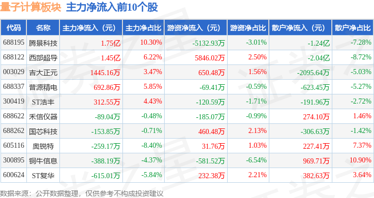 从资金流向上来看,当日量子计算板块主力资金净流入1.21亿元,游资资金净流入1.75亿元,散户资金净流出2.96亿元。量子计算板块个股资金流向见下表: