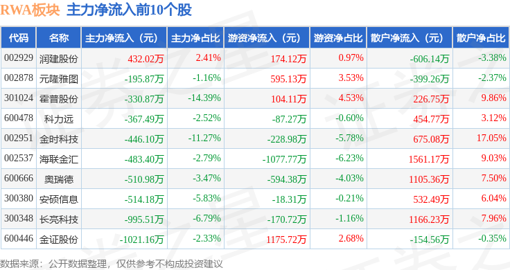 从资金流向上来看,当日RWA板块主力资金净流出4.22亿元,游资资金净流入6644.82万元,散户资金净流入3.56亿元。RWA板块个股资金流向见下表: