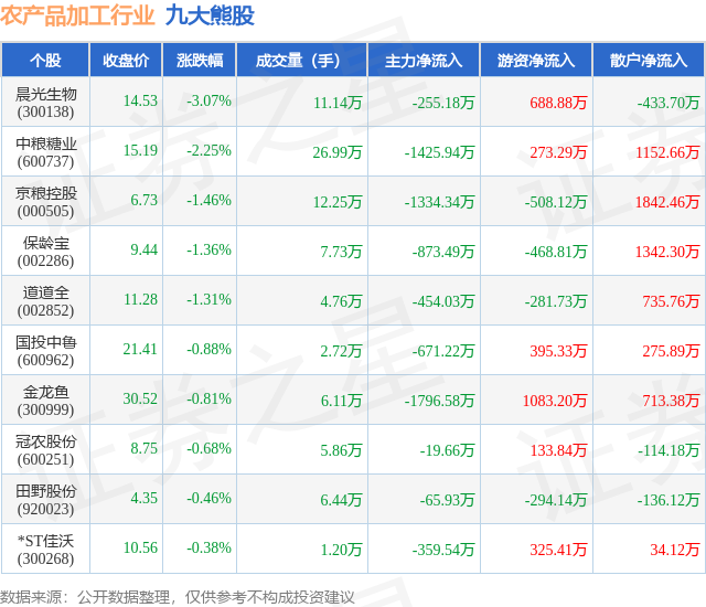 个股表现方面,农产品加工行业当日领跌股为晨光生物(300138),该股当日报收14.53,下跌3.07%,成交量11.14万,主力资金净流出255.18万元。中粮糖业(600737)以下跌2.25%紧随其后,该股当日成交量26.99万,主力资金净流出1425.94万元。除此之外,京粮控股(000505)、保龄宝(002286)、道道全(002852)均进入当日熊股之列。具体个股列表见下表: