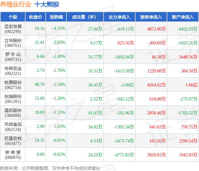 个股表现方面,养殖业行业当日领跌股为圣农发展(002299),该股当日报收16.16,下跌4.15%,成交量27.66万,主力资金净流出419.13万元。立华股份(300761)以下跌3.65%紧随其后,该股当日成交量9.17万,主力资金净流入623.56万元。除此之外,罗 牛 山(000735)、华英农业(002321)、牧原股份(002714)均进入当日熊股之列。具体个股列表见下表:
