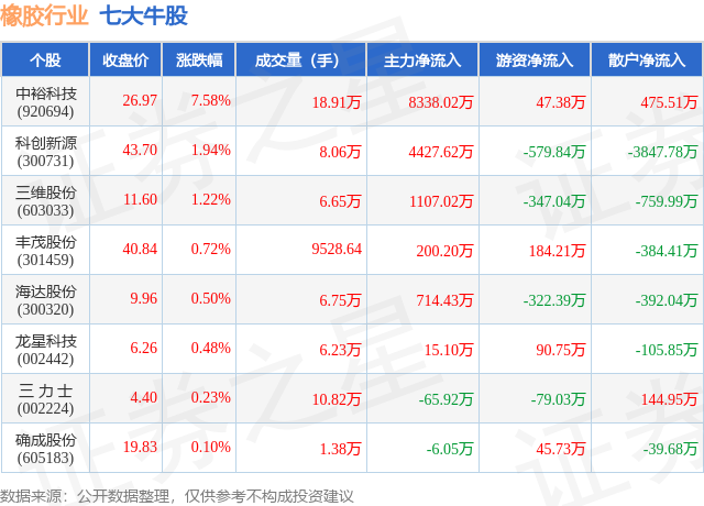 个股表现方面,橡胶行业当日领涨股为中裕科技(920694),该股当日报收26.97,上涨7.58%,成交量18.91万,主力资金净流入8338.02万元。科创新源(300731)以上涨1.94%紧随其后,该股当日成交量8.06万,主力资金净流入4427.62万元。除此之外,三维股份(603033)、丰茂股份(301459)、海达股份(300320)均进入当日牛股之列。具体个股列表见下表: