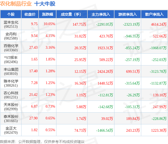个股表现方面,农化制品行业当日领涨股为蓝丰生化(002513),该股当日报收9.75,上涨10.05%,成交量147.75万,主力资金净流出2291.05万元。史丹利(002588)以上涨4.15%紧随其后,该股当日成交量31.02万,主力资金净流入423.7万元。除此之外,百傲化学(603360)、*ST辉丰(002496)、丰山集团(603810)均进入当日牛股之列。具体个股列表见下表: