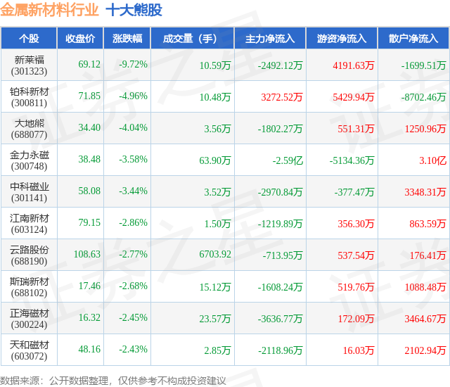 个股表现方面,金属新材料行业当日领跌股为新莱福(301323),该股当日报收69.12,下跌9.72%,成交量10.59万,主力资金净流出2492.12万元。铂科新材(300811)以下跌4.96%紧随其后,该股当日成交量10.48万,主力资金净流入3272.52万元。除此之外,大地熊(688077)、金力永磁(300748)、中科磁业(301141)均进入当日熊股之列。具体个股列表见下表: