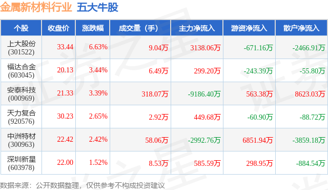 个股表现方面,金属新材料行业当日领涨股为上大股份(301522),该股当日报收33.44,上涨6.63%,成交量9.04万,主力资金净流入3138.06万元。福达合金(603045)以上涨3.44%紧随其后,该股当日成交量6.49万,主力资金净流入299.2万元。除此之外,安泰科技(000969)、天力复合(920576)、中洲特材(300963)均进入当日牛股之列。具体个股列表见下表: