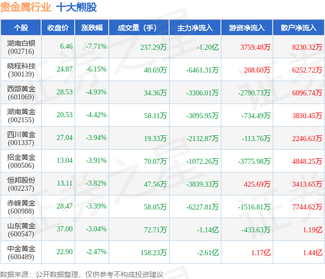 个股表现方面,贵金属行业当日领跌股为湖南白银(002716),该股当日报收6.46,下跌7.71%,成交量237.29万,主力资金净流出1.2亿元。晓程科技(300139)以下跌6.15%紧随其后,该股当日成交量40.69万,主力资金净流出6461.31万元。除此之外,西部黄金(601069)、湖南黄金(002155)、四川黄金(001337)均进入当日熊股之列。具体个股列表见下表: