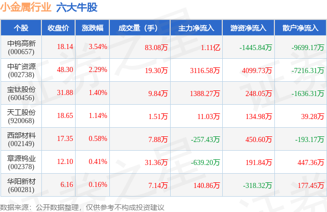 个股表现方面,小金属行业当日领涨股为中钨高新(000657),该股当日报收18.14,上涨3.54%,成交量83.08万,主力资金净流入1.11亿元。中矿资源(002738)以上涨2.29%紧随其后,该股当日成交量19.3万,主力资金净流入3116.58万元。除此之外,宝钛股份(600456)、天工股份(920068)、西部材料(002149)均进入当日牛股之列。具体个股列表见下表: