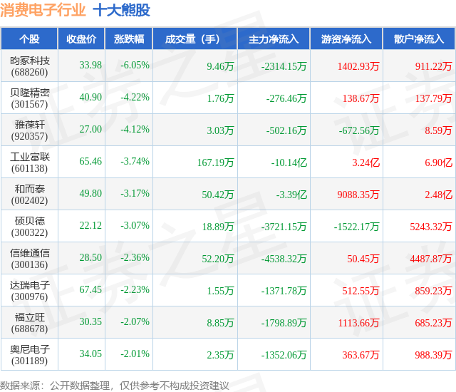 个股表现方面,消费电子行业当日领跌股为昀冢科技(688260),该股当日报收33.98,下跌6.05%,成交量9.46万,主力资金净流出2314.15万元。贝隆精密(301567)以下跌4.22%紧随其后,该股当日成交量1.76万,主力资金净流出276.46万元。除此之外,雅葆轩(920357)、工业富联(601138)、和而泰(002402)均进入当日熊股之列。具体个股列表见下表: