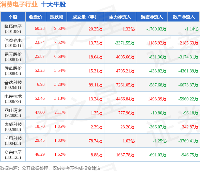 个股表现方面,消费电子行业当日领涨股为隆扬电子(301389),该股当日报收60.28,上涨9.5%,成交量20.25万,主力资金净流入1.32亿元。信濠光电(301051)以上涨7.52%紧随其后,该股当日成交量13.73万,主力资金净流出3371.55万元。除此之外,易天股份(300812)、胜蓝股份(300843)、奋达科技(002681)均进入当日牛股之列。具体个股列表见下表: