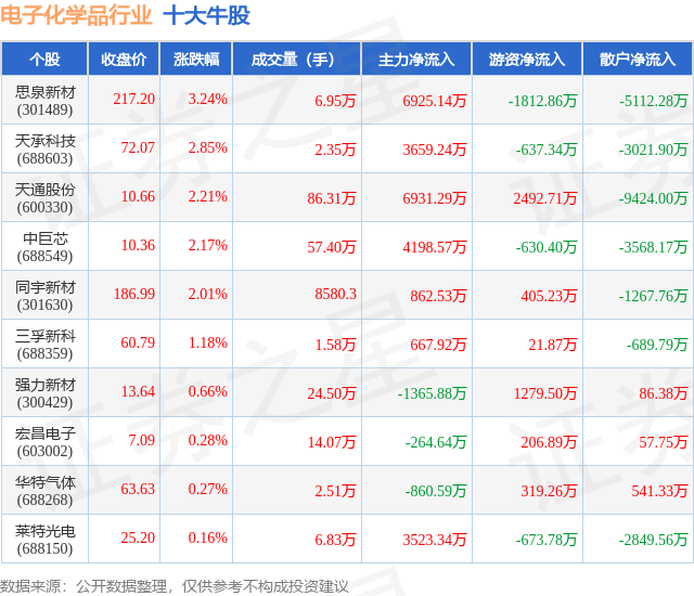 个股表现方面,电子化学品行业当日领涨股为思泉新材(301489),该股当日报收217.2,上涨3.24%,成交量6.95万,主力资金净流入6925.14万元。天承科技(688603)以上涨2.85%紧随其后,该股当日成交量2.35万,主力资金净流入3659.24万元。除此之外,天通股份(600330)、中巨芯(688549)、同宇新材(301630)均进入当日牛股之列。具体个股列表见下表: