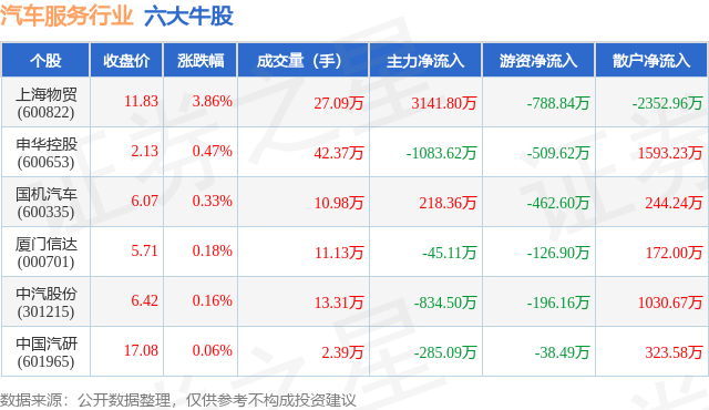 个股表现方面,汽车服务行业当日领涨股为上海物贸(600822),该股当日报收11.83,上涨3.86%,成交量27.09万,主力资金净流入3141.8万元。申华控股(600653)以上涨0.47%紧随其后,该股当日成交量42.37万,主力资金净流出1083.62万元。除此之外,国机汽车(600335)、厦门信达(000701)、中汽股份(301215)均进入当日牛股之列。具体个股列表见下表: