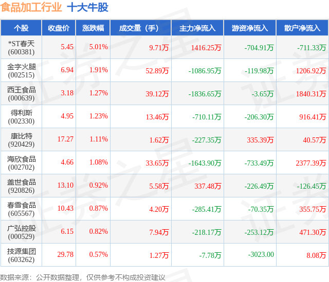个股表现方面,食品加工行业当日领涨股为*ST春天(600381),该股当日报收5.45,上涨5.01%,成交量9.71万,主力资金净流入1416.25万元。金字火腿(002515)以上涨1.91%紧随其后,该股当日成交量52.89万,主力资金净流出1086.95万元。除此之外,西王食品(000639)、得利斯(002330)、康比特(920429)均进入当日牛股之列。具体个股列表见下表: