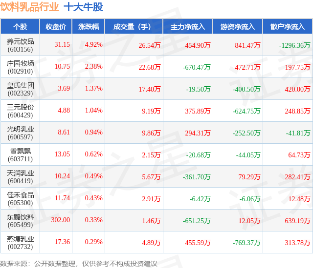 个股表现方面,饮料乳品行业当日领涨股为养元饮品(603156),该股当日报收31.15,上涨4.92%,成交量26.54万,主力资金净流入454.9万元。庄园牧场(002910)以上涨2.38%紧随其后,该股当日成交量22.68万,主力资金净流出670.47万元。除此之外,皇氏集团(002329)、三元股份(600429)、光明乳业(600597)均进入当日牛股之列。具体个股列表见下表: