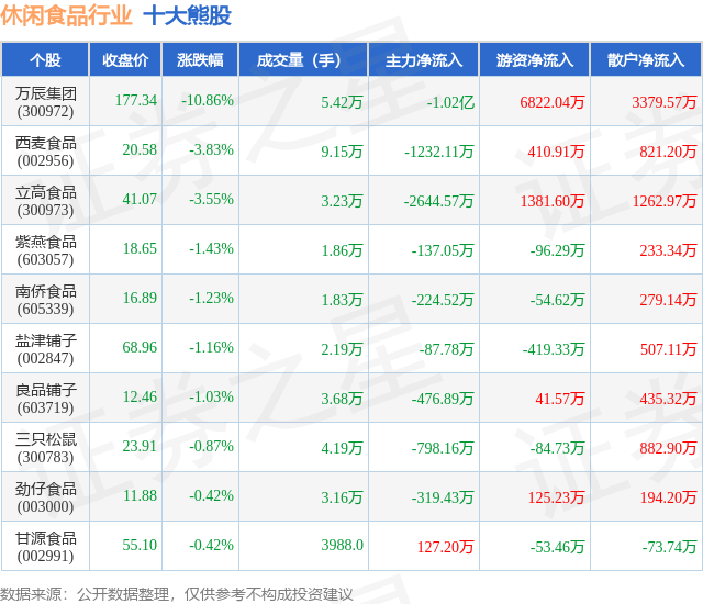 个股表现方面,休闲食品行业当日领跌股为万辰集团(300972),该股当日报收177.34,下跌10.86%,成交量5.42万,主力资金净流出1.02亿元。西麦食品(002956)以下跌3.83%紧随其后,该股当日成交量9.15万,主力资金净流出1232.11万元。除此之外,立高食品(300973)、紫燕食品(603057)、南侨食品(605339)均进入当日熊股之列。具体个股列表见下表: