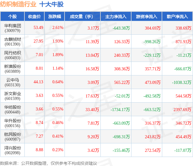 个股表现方面,纺织制造行业当日领涨股为华利集团(300979),该股当日报收53.49,上涨2.61%,成交量3.17万,主力资金净流出643.38万元。古麒绒材(001390)以上涨1.93%紧随其后,该股当日成交量11.39万,主力资金净流入126.33万元。除此之外,凤竹纺织(600493)、新澳股份(603889)、云中马(603130)均进入当日牛股之列。具体个股列表见下表: