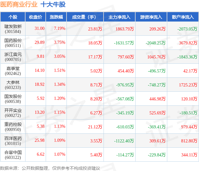 个股表现方面,医药商业行业当日领涨股为建发致新(301584),该股当日报收31.0,上涨7.19%,成交量23.81万,主力资金净流入1863.79万元。国药股份(600511)以上涨3.75%紧随其后,该股当日成交量18.05万,主力资金净流出1631.57万元。除此之外,浙江震元(000705)、嘉事堂(002462)、大参林(603233)均进入当日牛股之列。具体个股列表见下表: