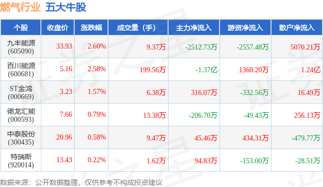 个股表现方面,燃气行业当日领涨股为九丰能源(605090),该股当日报收33.93,上涨2.6%,成交量9.37万,主力资金净流出2512.73万元。百川能源(600681)以上涨2.58%紧随其后,该股当日成交量199.56万,主力资金净流出1.37亿元。除此之外,ST金鸿(000669)、德龙汇能(000593)、中泰股份(300435)均进入当日牛股之列。具体个股列表见下表: