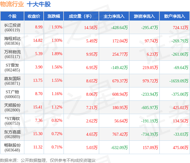 个股表现方面,物流行业当日领涨股为长江投资(600119),该股当日报收8.99,上涨1.93%,成交量14.58万,主力资金净流出428.64万元。海程邦达(603836)以上涨1.93%紧随其后,该股当日成交量5.49万,主力资金净流入172.04万元。除此之外,万林物流(603117)、ST雪发(002485)、嘉友国际(603871)均进入当日牛股之列。具体个股列表见下表: